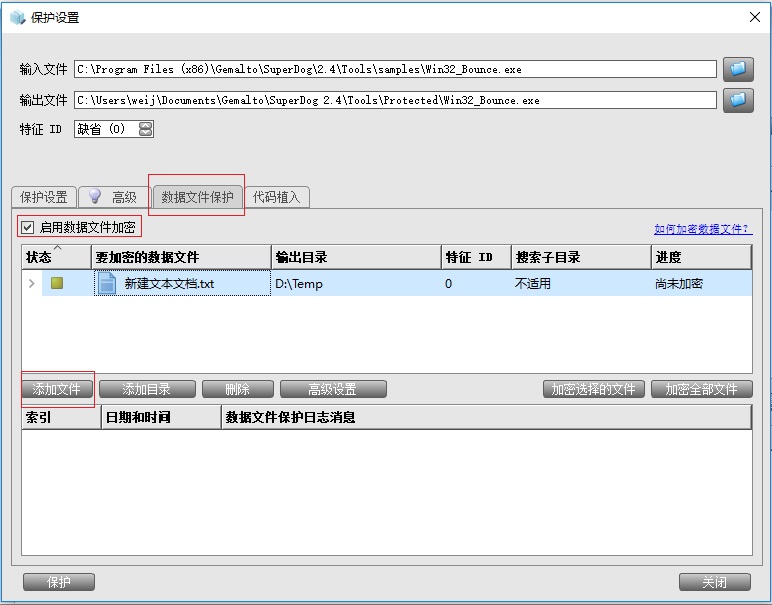 首先調用該數據加密文件的主程序需要一起放入加密列表,與之關聯的數據文件加載到“數據文件保護”選項,開啟“啟用數據文件加密”,然后分別點“保護”和“加密全部文件”。