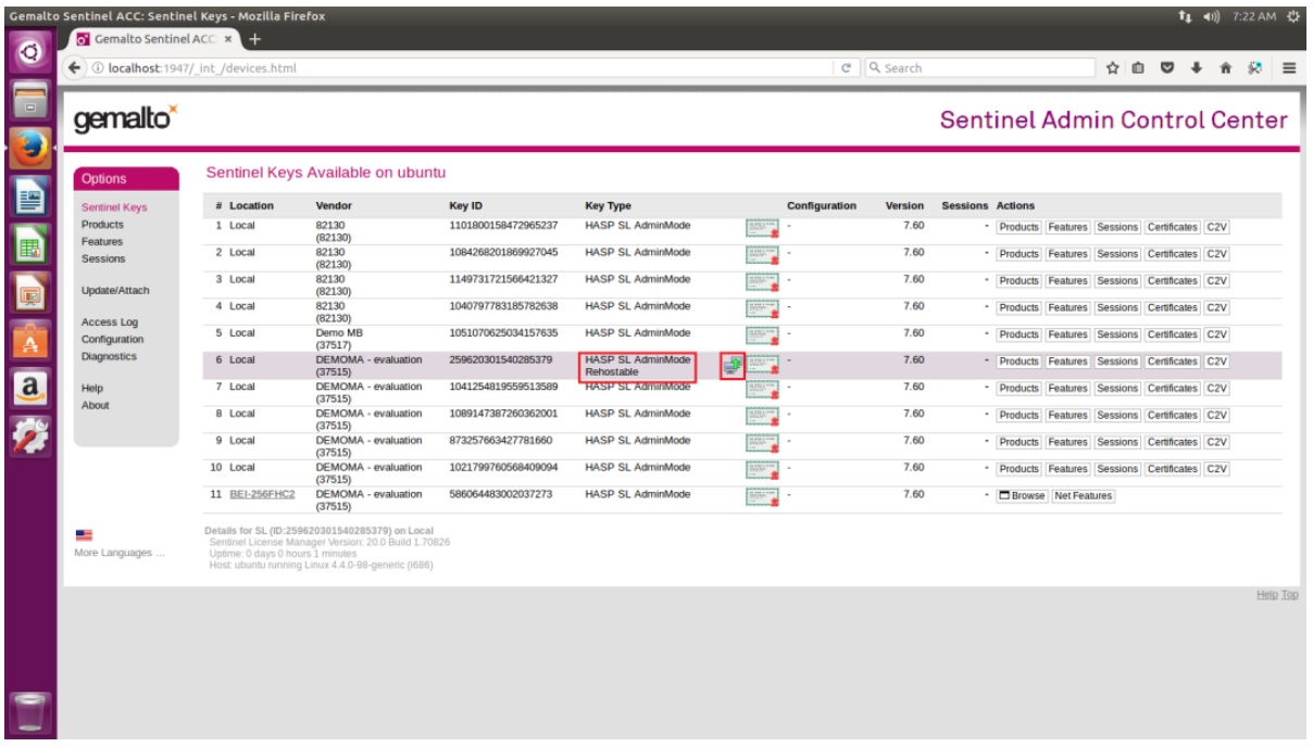 SL能夠?qū)崿F(xiàn) Rehost 的前提條件是 SL本身是可遷移的,也就是 Rehostable 的。可以進(jìn)入 A 電腦上打開 ACC(瀏覽器打開 http://localhost:1947,點(diǎn)擊 Sentinel Keys 查看 SL的狀態(tài)),如下邊截圖所示紅色框?qū)?yīng)的這個(gè) SL就是 Rehostable的,可以遷移,其它SL都不可遷移。如果想遷移其它 SL,就必須將 SL升級(jí)為具備 Rehostable 屬性。 具體請(qǐng)看下邊的步驟二。