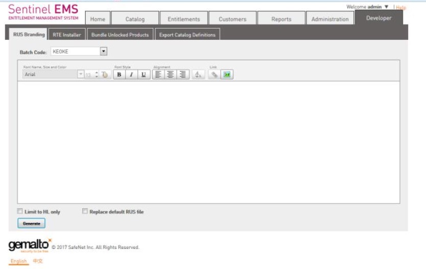 去開發(fā)電腦上打開 EMS,進(jìn)入 Developer 標(biāo)簽頁,可以看到RUS Branding標(biāo)簽頁, BatchCode選擇你的正式號(hào)(比如截圖中的 KEOKE),插上主鎖,點(diǎn)擊左下角的 Generate,就可以產(chǎn)生正式號(hào)對(duì)應(yīng)的 RUS 遠(yuǎn)程升級(jí)工具。