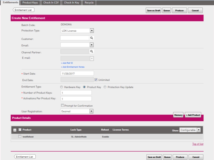 (c、 )去 EMS 里邊Entitlement 標(biāo)簽頁下,像正常升級(jí)加密鎖一樣的標(biāo)準(zhǔn)步驟進(jìn)行操作。新建 Entitlement,然后Entitlement type選擇中間的Product Key,添加上剛才定義的產(chǎn)品testRehost,然后點(diǎn)擊 Produce,接著 Activate。