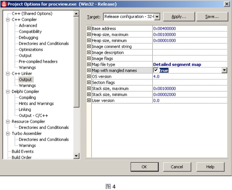使用 Embarcadero® C++Builder®(XE, XE2 或 XE3)其中任意一個編輯器打開一個已有的 C++工程,在菜單欄中選擇: Project——Options,這將打開工程的 Project Options 對話框, 選擇 C++ Linker——Output,在選項 Map file type 處選擇:“Detailed segment map”,并勾選選項:“Map with mangled names”(如圖 4),點擊確定按鈕,然后重新編譯整個工程, map 文件將與 exe 文件生成到同一目錄中。